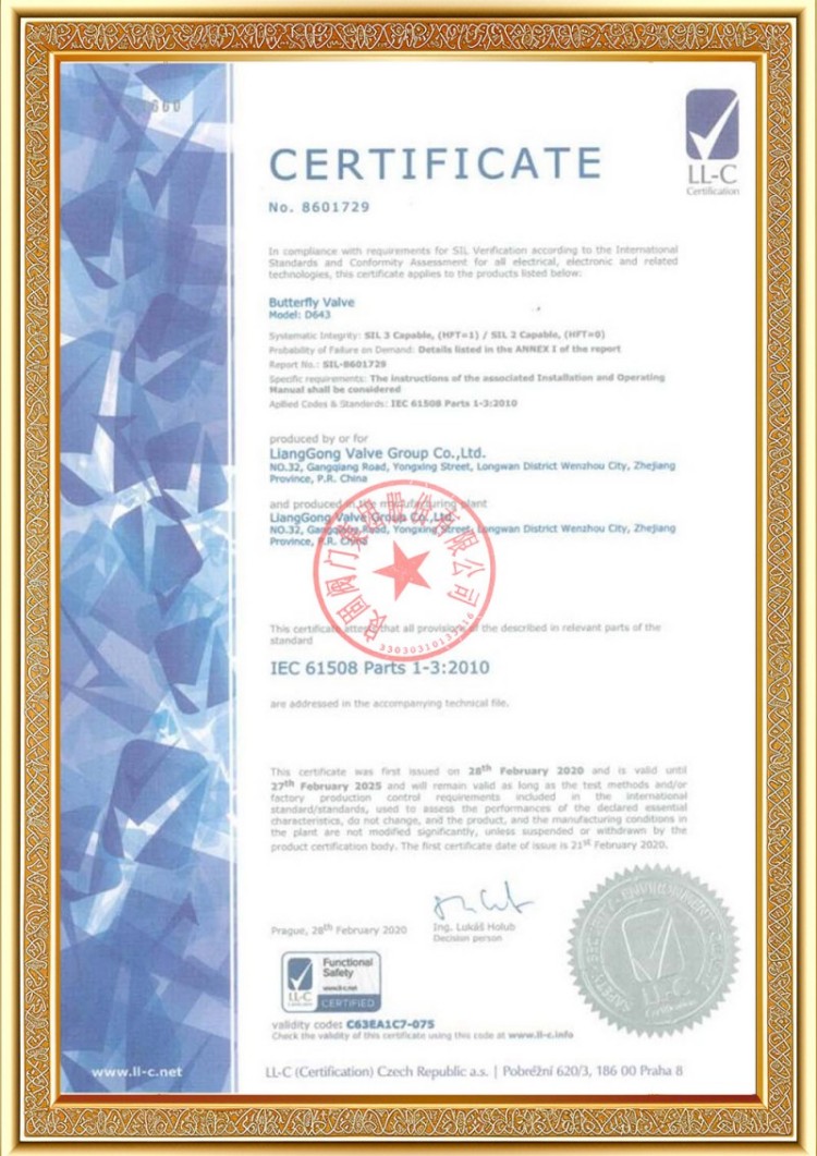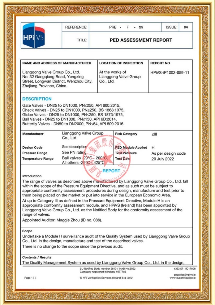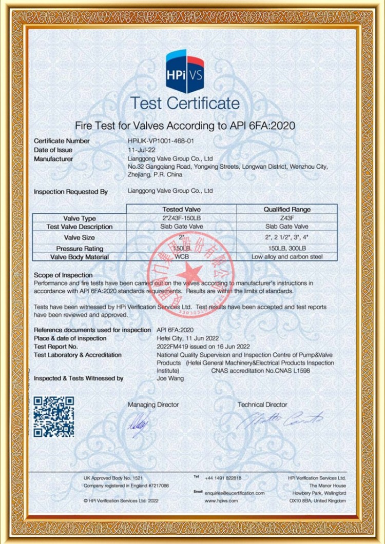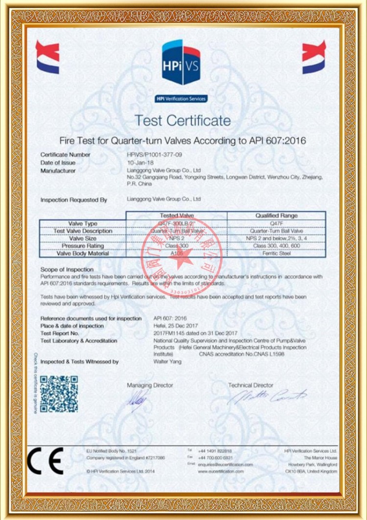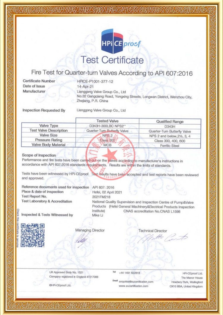 当社はさまざまな圧力パイプラインバルブの製造ライセンスを取得しており、当社の製品はTS A1、ISO 9001、ISO 14001、ISO 45001、API 6D、API 600、APL 609、CE/PED、API 607、API 6FA、ISO 15848-1、およびEACシステムおよび製品認証に合格しています。ボールバルブ、バタフライバルブ、安全弁、ストップバルブなど各種バルブの発明特許証明書も保有しております。